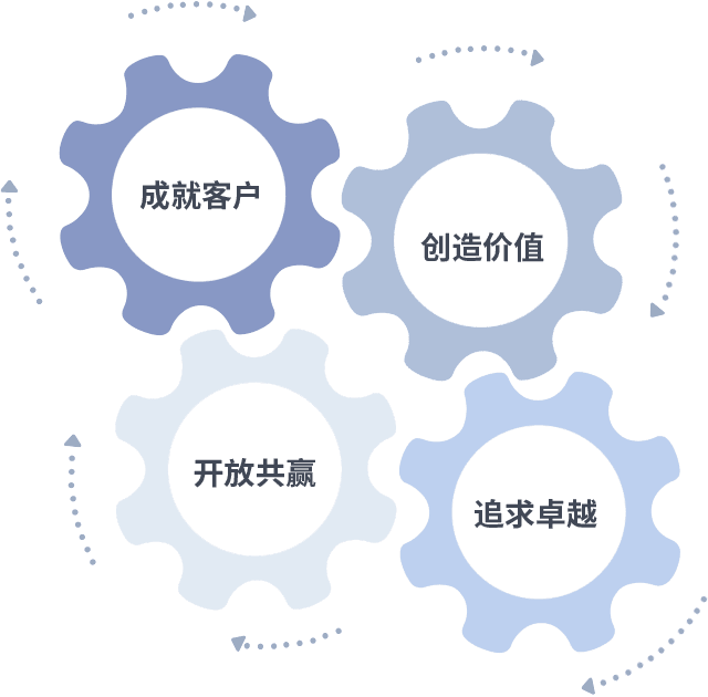 成就客户是一切决策的出发点,,,创造价值是衡量所有工作的标准,,,追求卓越是我们做事做人的态度,,,,开放共赢是我们的格局也是最终的结果。。。价值观的齿轮环环相扣,,推动着组织里的每个人不断向前。。